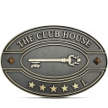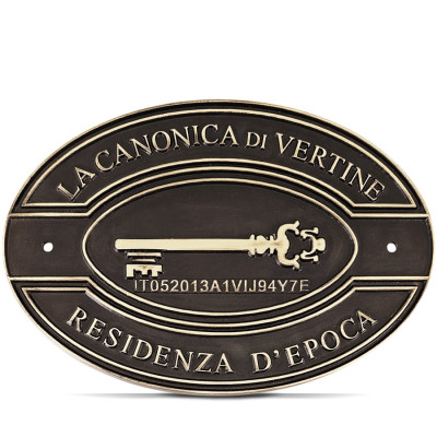 Targa classificazione per hotel di lusso realizzata in ottone brunito e personalizzabile con nome della struttura, stelle e codice CIN. Fornita di viti, tasselli e copriviti. Targa personalizzabile sia nelle scritte che nelle dimensioni.